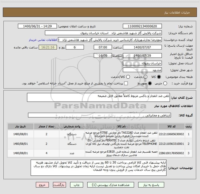 نام دستگاه خریدار:شرکت پالایش گاز شهید هاشمی نژاد استان خراسان رضوی