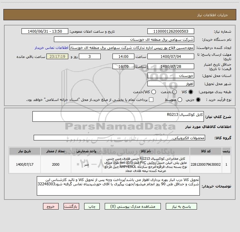 | 1 | 2281200079630002 | کابل مخابراتی کواکسیال RG213 جنس هادی مس جنس عایق پلی اتیلن جنس روکش PVC قطر 10/3 mm طول متری نوع بسته بندی قرقره مرجع سازنده AMPHENOL چین مرجع عرضه کننده نیمه هادی عماد | متر | 2000 | 1400/07/17 |