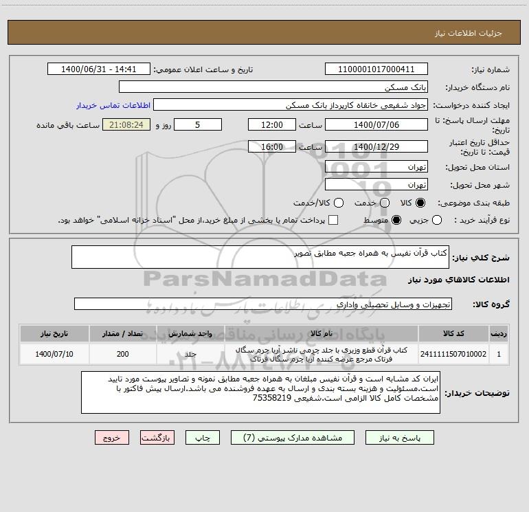 توضیحات خریدار:ایران کد مشابه است و قرآن نفیس مبلغان به همراه جعبه مطابق نمونه و تصاویر پیوست مورد تایید است.مسئولیت و هزینه بسته بندی و ارسال به عهده فروشنده می باشد.ارسال پیش فاکتور با مشخصات کامل کالا الزامی است.شفیعی 75358219