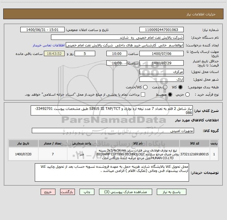 شرح کلی نیاز: نیاز شامل 2 قلم به تعداد 7 عدد تیغه اره نواری و SINUS III TAP/TCT طبق مشخصات پیوست 33492701-086