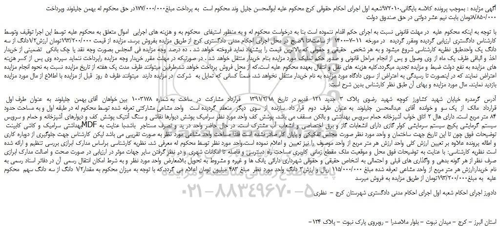 با توجه به اینکه محکوم علیه  در مهلت قانونی نسبت به اجرای حکم اقدام ننموده است بنا به درخواست محکوم له و به منظور استیفای  محکوم به و هزینه های اجرایی  اموال متعلق به محکوم علیه توسط این اجرا توقیف وتوسط کارشناس دادگستری ارزیابی گردیده ومقرر گردیده  در مورخه  11-7-1400  از ساعت8تا 9صبح در محل اجرای احکام مدنی دادگستری کرج از طریق مزایده بفروش برسد. مزایده از قیمت 193/200/000تومان ارزش1/2دانگ از سه دانگ یک واحدطبق نظریه کارشناسی شروع میشود و به هر شخص  حقیقی و حقوقی که بالاترین قیمت را پیشنهاد نماید فروخته خواهد شد . ده درصد وجه مزایده فی المجلس بصورت وجه نقد یا چک بانکی  تضمینی از خریدار اخذ و الباقی ظرف یک ماه از وی وصول و پس از انجام مراحل قانونی و صدور حکم تملیک مورد مزایده بنام خریدار منتقل خواهد شد . در صورتیکه در مهلت مقرر خریدار وجه مزایده راپرداخت ننماید سپرده وی پس از کسر هزینه های مزایده به نفع دولت ضبط و مزایده تجدید میگردد.کلیه هزینه های نقل و انتقال بعهده محکوم علیه است.که از محل فروش پرداخت خواهد شد.طرفین میتوانند ظرف مدت یک هفته از تاریخ مزایده نسبت به نحوه انجام مزایده اعتراض نمایند که در اینصورت تا رسیدگی به اعتراض از سوی دادگاه مورد مزایده به نام خریدار منتقل نخواهد شد. ضمناً کسانی که تمایل به  شرکت  در مزایده دارند  میتوانند ظرف 5 روز  قبل از مزایده با اطلاع از مال مورد مزایده بازدید نمایند. مال مورد مزایده و بهای آن طبق نظر کارشناس بدین شرح است: