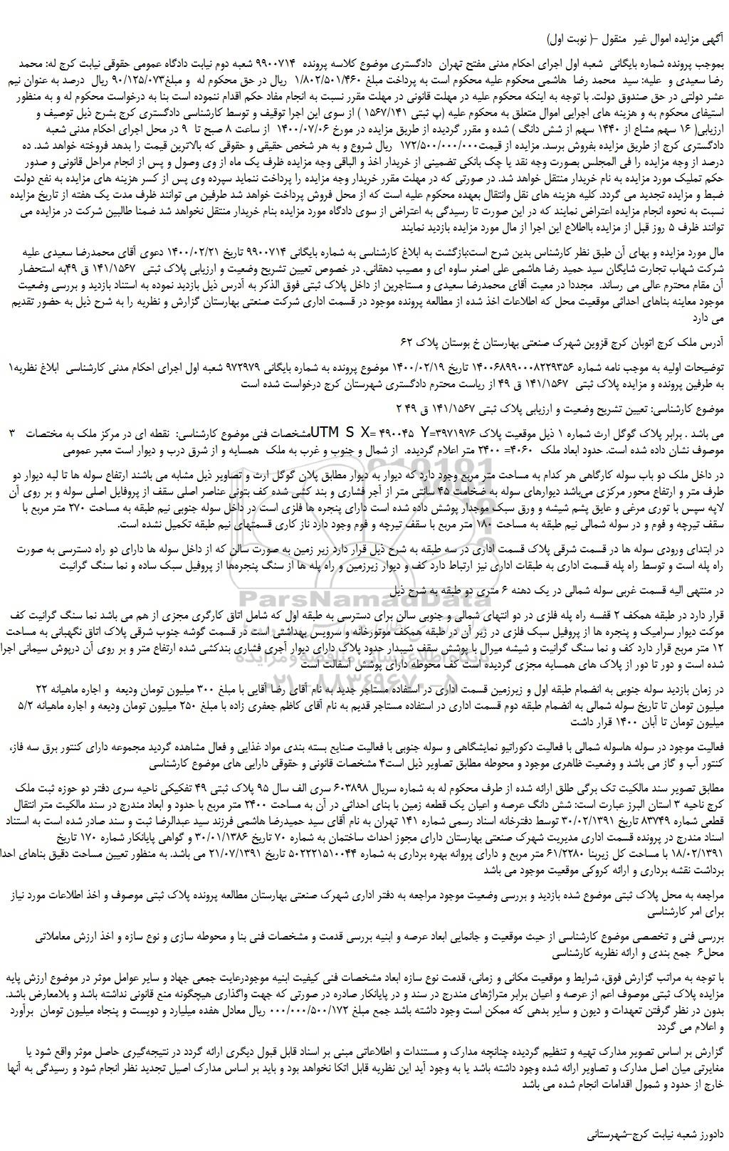 بموجب پرونده شماره بایگانی  شعبه اول اجرای احکام مدنی مفتح تهران  دادگستری موضوع کلاسه پرونده  9900714 شعبه دوم نیابت دادگاه عمومی حقوقی نیابت کرج له: محمد رضا سعیدی و  علیه: سید  محمد رضا  هاشمی محکوم علیه محکوم است به پرداخت مبلغ 1/802/501/460  ریال در حق محکوم له  و مبلغ90/125/073 ریال  درصد به عنوان نیم عشر دولتی در حق صندوق دولت. با توجه به اینکه محکوم علیه در مهلت قانونی در مهلت مقرر نسبت به انجام مفاد حکم اقدام ننموده است بنا به درخواست محکوم له و به منظور استیفای محکوم به و هزینه های اجرایی اموال متعلق به محکوم علیه (پ ثبتی 1567/141 ) از سوی این اجرا توقیف و توسط کارشناسی دادگستری کرج بشرح ذیل توصیف و ارزیابی( 16 سهم مشاع از 1440 سهم از شش دانگ ) شده و مقرر گردیده از طریق مزایده در مورخ 1400/07/06  از ساعت 8 صبح تا  9 در محل اجرای احکام مدنی شعبه دادگستری کرج از طریق مزایده بفروش برسد. مزایده از قیمت172/500/000/000  ریال شروع و به هر شخص حقیقی و حقوقی که بالاترین قیمت را بدهد فروخته خواهد شد. ده درصد از وجه مزایده را فی المجلس بصورت وجه نقد یا چک بانکی تضمینی از خریدار اخذ و الباقی وجه مزایده ظرف یک ماه از وی وصول و پس از انجام مراحل قانونی و صدور حکم تملیک مورد مزایده به نام خریدار منتقل خواهد شد. در صورتی که در مهلت مقرر خریدار وجه مزایده را پرداخت ننماید سپرده وی پس از کسر هزینه های مزایده به نفع دولت ضبط و مزایده تجدید می گردد. کلیه هزینه های نقل وانتقال بعهده محکوم علیه است که از محل فروش پرداخت خواهد شد طرفین می توانند ظرف مدت یک هفته از تاریخ مزایده نسبت به نحوه انجام مزایده اعتراض نمایند که در این صورت تا رسیدگی به اعتراض از سوی دادگاه مورد مزایده بنام خریدار منتقل نخواهد شد ضمنا طالبین شرکت در مزایده می توانند ظرف 5 روز قبل از مزایده بااطلاع این اجرا از مال مورد مزایده بازدید نمایند