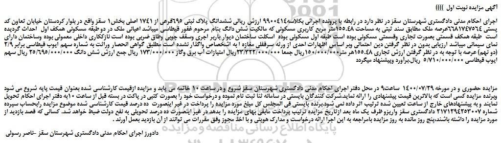 مزایده حضوری و در مورخه 1400/07/29 ساعت9 در محل دفتر اجرای احکام مدنی دادگستری شهرستان سقز شروع و در ساعت 10 خاتمه می یابد و مزایده ازقیمت کارشناسی شده بعنوان قیمت پایه شروع می شود وبرنده مزایده کسی است که بالاترین قیمت پیشنهادی را ارائه نماید.شرکت کنندگان بایستی در سامانه ثنا ثبت نام نموده و درخواست خود را بصورت کتبی در پاکت در بسته قبل از ساعت 10به دفتر اجرای احکام تحویل نمایند و به پیشنهادهای خارج از ساعت تعیین شده ترتیب اثر داده نمی شود.برنده بایستی فی المجلس کل مبلغ مورد مزایده را پرداخت در غیر اینصورت ده درصد قیمت کارشناسی شده موضوع مزایده رابحساب سپرده شماره 2171294253007 دادگستری سقز واریزو ظرف یک ماه بعد ازتاریخ مزایده ترتیب پرداخت مابقی بهای مزایده را بدهد در غیر اینصورت ده درصد تحویلی به نفع دولت ضبط خواهد شد. کسانی که قصد بازدید از مورد مزایده را داشته باشند،پنج روز مانده به روز مزایده بامراجعه به این اجرا ارائه درخواست و مدارک هویتی و با اخذ مجوز وفق مقررات می توانند از آن بازدید بعمل آورند .