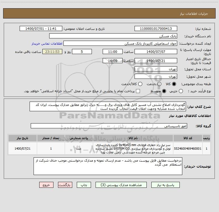 شرح کلی نیاز: گودبرداری اصلاح نشتی آب مسیر کابل های ورودی برق و.....به دیزل ژنراتور مطابق مدارک پیوست، ایران کد انتخاب شده مشابه وجهت اعلان قیمت انتخاب گردیده است