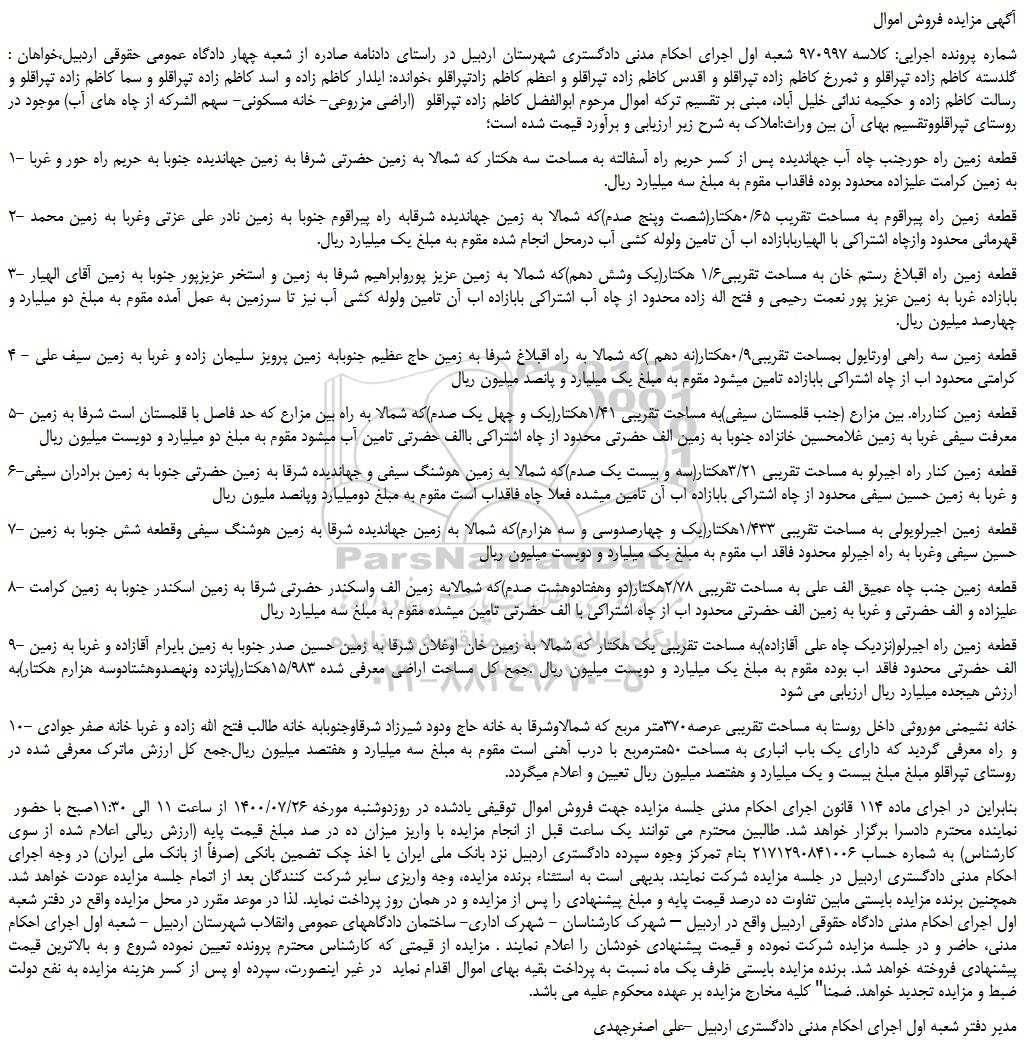 شماره پرونده اجرایی: کلاسه 970997 شعبه اول اجرای احکام مدنی دادگستری شهرستان اردبیل در راستای دادنامه صادره از شعبه چهار دادگاه عمومی حقوقی اردبیل،خواهان : گلدسته کاظم زاده تپراقلو و ثمررخ کاظم زاده تپراقلو و اقدس کاظم زاده تپراقلو و اعظم کاظم زادتپراقلو ،خوانده: ایلدار کاظم زاده و اسد کاظم زاده تپراقلو و سما کاظم زاده تپراقلو و رسالت کاظم زاده و حکیمه ندائی خلیل آباد، مبنی بر تقسیم ترکه اموال مرحوم ابوالفضل کاظم زاده تپراقلو (اراضی مزروعی- خانه مسکونی- سهم الشرکه از چاه های آب) موجود در روستای تپراقلووتقسیم بهای آن بین وراث:املاک به شرح زیر ارزیابی و برآورد قیمت شده است؛