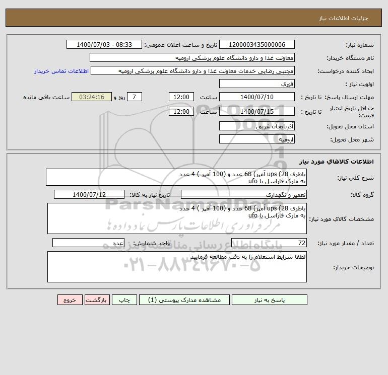 مشخصات کالای مورد نیاز: باطری ups (28 آمپر) 68 عدد و (100 آمپر ) 4 عدد به مارک فاراسل یا ufo