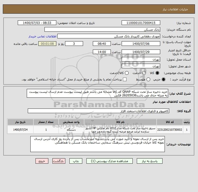 شرح کلی نیاز: خرید ذخیره ساز تحت شبکه QNAP کد کالا مشابه می باشد طبق لیست پیوست عدم ارسال لیست پیوست به منزله حذف می باشد26205036 فکس