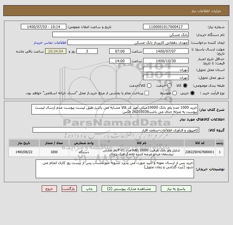 شرح کلی نیاز: خرید 1000 عدد پاور بانک 10000میلی آمپر کد کالا مشابه می باشد طبق لیست پیوست عدم ارسال لیست پیوست به منزله حذف می باشد26205036 فکس