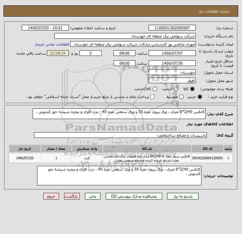 شرح کلی نیاز: کانکس 2/40*6 متری . ورق بیرون نمره 35 و ورق سقفی نمره 40 - درب فلزی و پنجره شیشه خور کشویی .