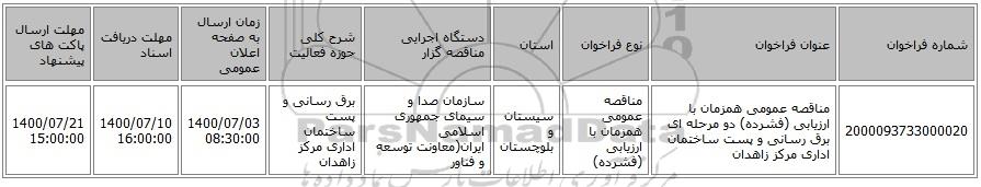 | 2000093733000020 | مناقصه عمومی همزمان با ارزیابی (فشرده) دو مرحله ای برق رسانی و پست ساختمان اداری مرکز زاهدان | مناقصه عمومی همزمان با ارزیابی (فشرده) | سیستان و بلوچستان | سازمان صدا و سیمای جمهوری اسلامی ایران(معاونت توسعه و فناور | برق رسانی و پست ساختمان اداری مرکز زاهدان | 1400/07/03 08:30:00 | 1400/07/10 16:00:00 | 1400/07/21 15:00:00 |