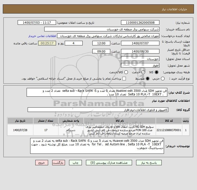 توضیحات خریدار:فن تجهیز SDH مدل Huawei osN 3500 به تعداد 5 عدد و selta sub - Rack SAFN -S به تعداد 2 عدد و for Tel . sid Autom line . Selta 10 PLA -T 10EXT به تعداد 10 عدد .مبلغ کل نوشته شود . جهت دیسپاچینگ جنوبغرب