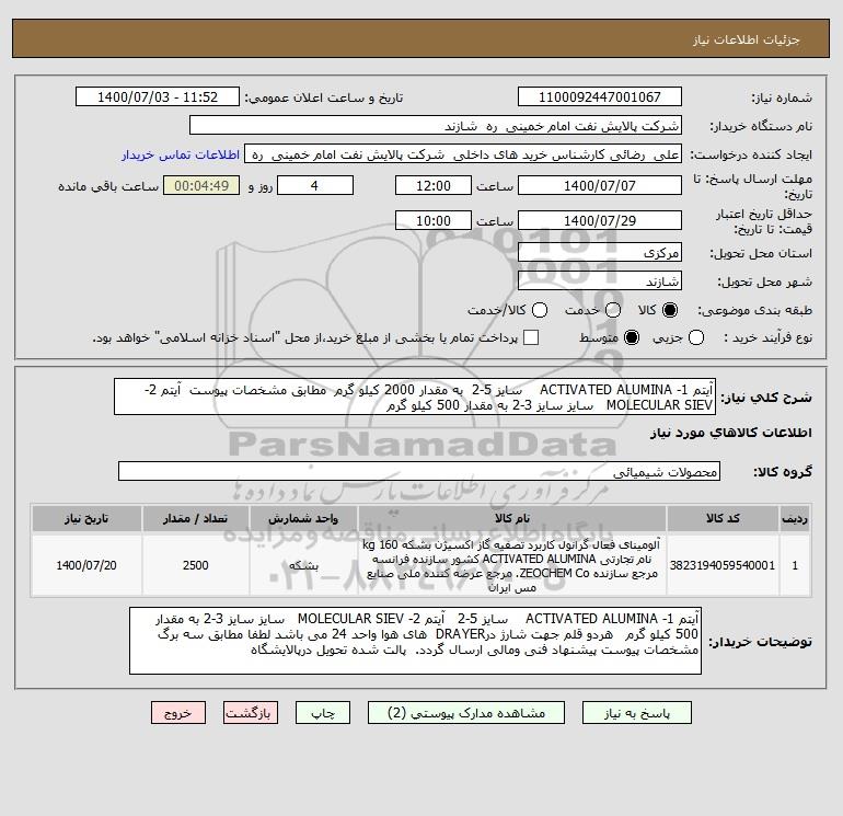شرح کلی نیاز: آیتم 1- ACTIVATED ALUMINA سایز 5-2 به مقدار 2000 کیلو گرم مطابق مشخصات پیوست آیتم 2- MOLECULAR SIEV سایز سایز 3-2 به مقدار 500 کیلو گرم
