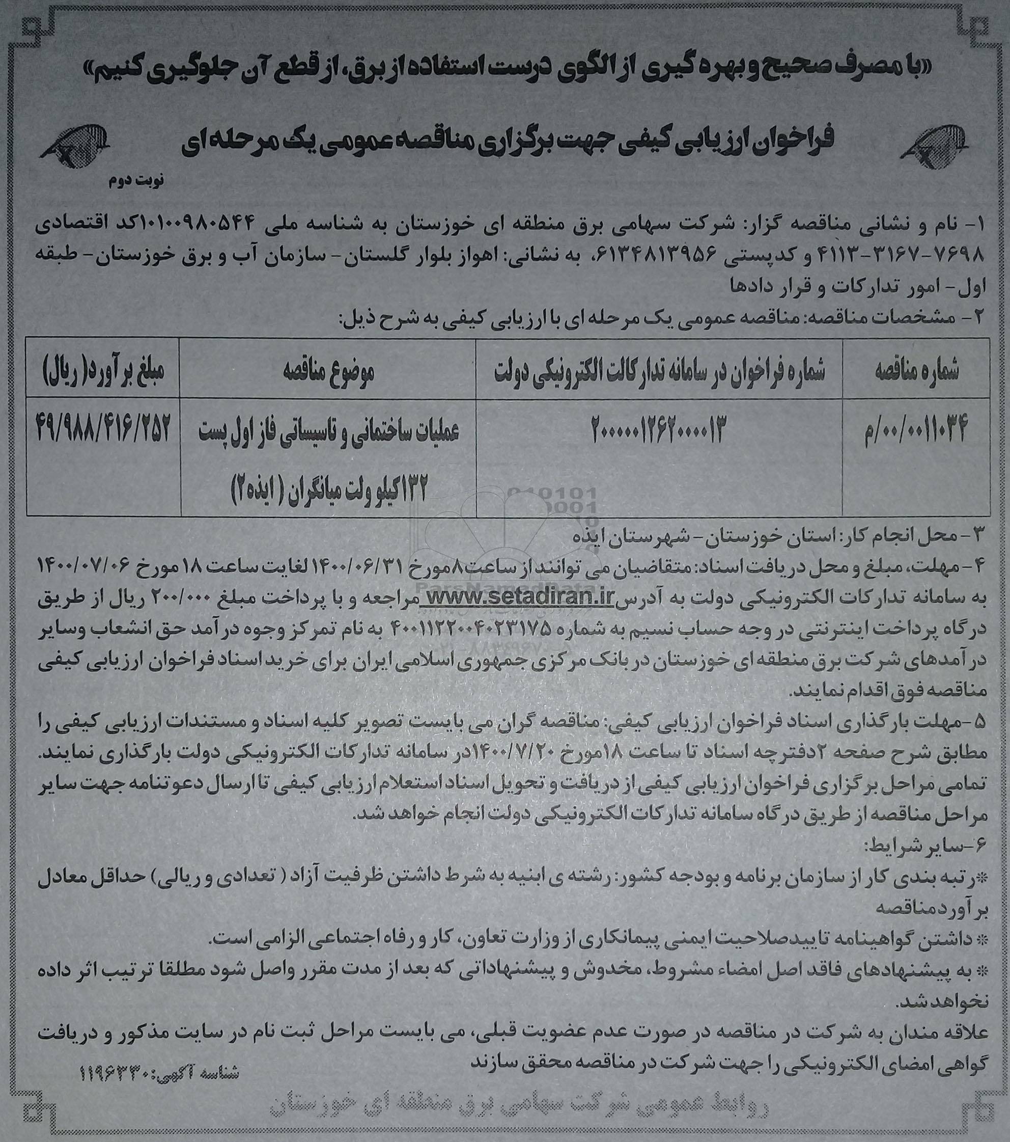 | 0011034/ 00/ م | 2000001262000013 | عملیات ساختمانی و تاسیساتی فاز اول پست 132 کیلوولت میانگران ایذه 2 | 49.988.416.252 |