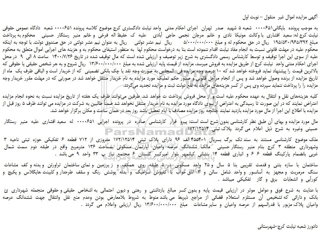 به موجب پرونده  بایگانی0000651  شعبه 5 شهید  صدر  تهران  اجرای احکام مدنی  واحد نیابت دادگستری کرج موضوع کلاسه پرونده 0000651 شعبه  دادگاه عمومی حقوقی نیابت کرج له: سعید  افشاری  با وکالت  مونیکا  نادی  و  خانم  مرجان  نجمی  حاجی  آبادی    علیه  ک  حفیظ اله  فرخی  و خانم  منیر  رستگار  حسینی    محکوم به پرداخت مبلغ 195/530/965/392  ریال در حق محکوم له و مبلغ 5/000/000/000      ریال  نیم عشر دولتی    ریال به عنوان نیم عشر دولتی در حق صندوق دولت. با توجه به اینکه محکوم علیه در مهلت قانونی نسبت به انجام مفاد نیابت اقدام ننموده است بنا به درخواست محکوم لها  به منظور استیفای محکوم به و هزینه های اجرایی اموال متعلق به محکوم علیه از سوی این اجرا توقیف و توسط کارشناس رسمی دادگستری به شرح زیر توصیف و ارزیابی شده است که مال توقیف شده در تاریخ 1400/7/26  ساعت 8 الی  9  در محل اجرای احکام مدنی واحد  نیابت کرج از طریق مزایده به فروش میرسد، مزایده از قیمت پایه ارزیابی شده به مبلغ 13/600/000/000  ریال شروع و به هر شخص حقیقی یا حقوقی که بالاترین قیمت را پیشنهاد نماید فروخته خواهد شد که ۱۰ درصد وجه مزایده فی  المجلس به صورت وجه نقد یا چک بانکی تضمینی  که از خریدار است و الباقی ظرف یک  ماه از تاریخ مزایده از برنده وصول خواهد شد و پس از انجام مراحل قانونی و صدور حکم تملیک مورد مزایده به نام خریدار منتقل خواهد شد در صورتی که در مهلت مقرر خریدار وجه مزایده را را پرداخت ننماید سپرده وی پس از کسر هزینه های مزایده به نفع دولت ثبت و مزایده تجدید می گردد.