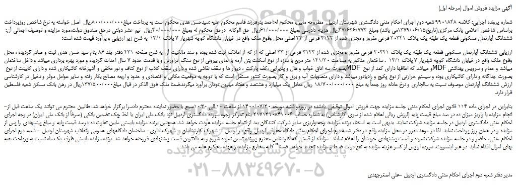 شماره پرونده اجرایی: کلاسه 9901848 شعبه دوم اجرای احکام مدنی دادگستری شهرستان اردبیل مطروحه مابین، محکوم له:احمد بدرفرزند قاسم محکوم علیه :سیدحسن هدی محکوم است به پرداخت مبلغ800/000/000ریال اصل خواسته به نرخ شاخص روزپرداخت براساس شاخص اعلامی بانک مرکزی(تاریخ1379/06/15می باشد) ومبلغ 27/626/772ریال هزینه دادرسی ومبلغ 61/000/000ریال حق الوکاله درحق محکوم له ومبلغ 40/000/000ریال نیم عشر دولتی درحق صندوق دولت،مورد مزایده و توصیف اجمالی آن: ششدانگ آپارتمان مسکونی قطعه یک طبقه یک پلاک 20341 فرعی مفروز و مجزی شده از 3123 فرعی از 33 اصلی محل وقوع ملک واقع در خیابان دانشگاه کوچه شهریار 7 پلاک 13/1 به شرح زیر ارزیابی و برآورد قیمت شده است؛
