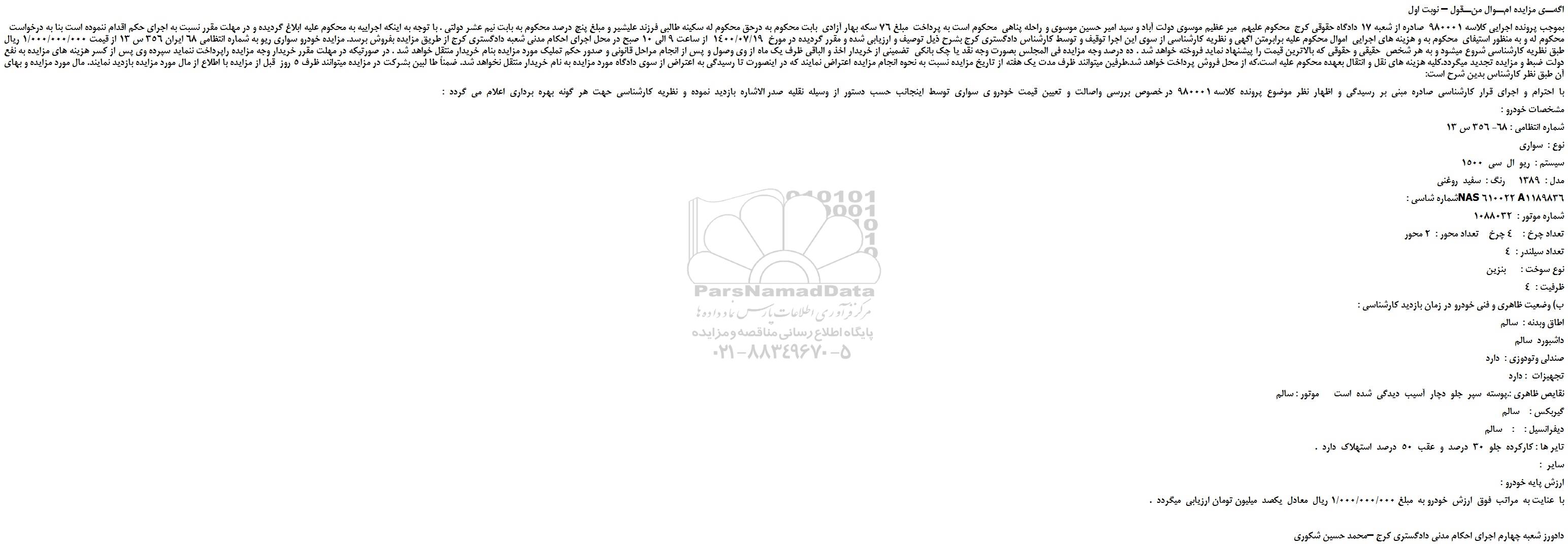 با احترام و اجرای قرار کارشناسی صادره مبنی بر رسیدگی و اظهار نظر موضوع پرونده کلاسه 980001 در خصوص بررسی واصالت و تعیین قیمت خودرو ی سواری توسط اینجانب حسب دستور از وسیله نقلیه صدر الاشاره بازدید نموده و نظریه کارشناسی حهت هر گونه بهره برداری اعلام می گردد :