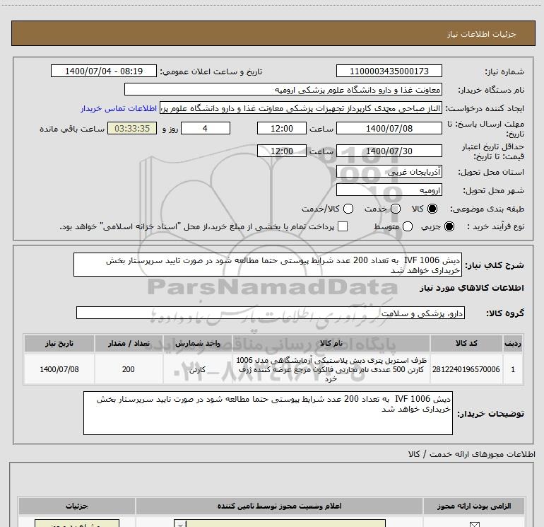شرح کلی نیاز: دیش 1006 IVF به تعداد 200 عدد شرایط پیوستی حتما مطالعه شود در صورت تایید سرپرستار بخش خریداری خواهد شد