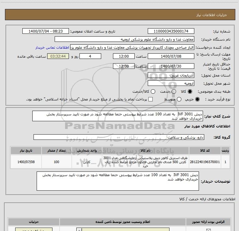 شرح کلی نیاز: دیش 3001 IVF به تعداد 100 عدد شرایط پیوستی حتما مطالعه شود در صورت تایید سرپرستار بخش خریداری خواهد شد