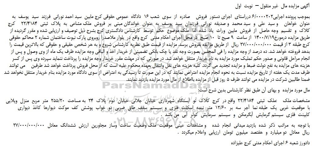 بموجب پرونده اجرایی6/0000202 درراستای اجرای دستور فروش صادره از سوی شعب 16 دادگاه عمومی حقوقی کرج مابین سید احمد نورانی فرزند سید یوسف به عنوان خواهان و سید علی و سید محمد و صدیقه نورانی فرزندان سید یوسف به عنوان خواندگان مبنی بر فروش ملک مشاعی به پلاک ثبتی 22/4184 کرج کلاک و تقسیم وجه حاصل از فروش مابین وراث یاد شده لذا ملک موضوع حکم توسط کارشناس دادگستری کرج بشرح ذیل توصیف و ارزیابی شده و مقرر گردیده از طریق مزایده درمورخ1400/7/19 از ساعت 9 صبح تا 10 صبح در محل اجرای احکام مدنی کرج واقع در بلوار ملاصدرا روبروی پارک نبوت ساختمان شماره 2 محاکم حقوقی کرج طبقه 3 از قیمت 27/000/000/000 ریال از طریق مزایده بفروش برسد. مزایده از قیمت طبق نظریه کارشناس شروع و به هر شخص حقیقی و حقوقی که بالاترین قیمت را بدهد فروخته خواهد شد. ده درصد از وجه مزایده را فی المجلس بصورت وجه نقد یا چک بانکی تضمینی از خریدار اخذ و الباقی وجه مزایده ظرف یک ماه از وی وصول و پس از انجام مراحل قانونی و صدور حکم تملیک مورد مزایده به نام خریدار منتقل خواهد شد. در صورتی که در مهلت مقرر خریدار وجه مزایده را پرداخت ننماید سپرده وی پس از کسر هزینه های مزایده به نفع دولت ضبط و مزایده تجدید می گردد. کلیه هزینه های نقل وانتقال بعهده محکوم علیه است که از محل فروش پرداخت خواهد شد طرفین می توانند ظرف مدت یک هفته از تاریخ مزایده نسبت به نحوه انجام مزایده اعتراض نمایند که در این صورت تا رسیدگی به اعتراض از سوی دادگاه مورد مزایده بنام خریدار منتقل نخواهد شد ضمنا طالبین شرکت در مزایده می توانند ظرف 5 روز قبل از مزایده بااطلاع از مال مورد مزایده بازدید نمایند.