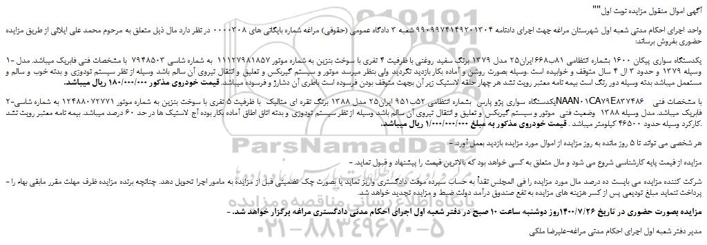 1- یکدستگاه سواری پیکان 1600 بشماره انتظامی 81ب668 ایران25 مدل 1379 برنگ سفید روغنی با ظرفیت 4 نفری با سوخت بنزین به شماره موتور 11127981857 به شماره شاسی 7948503 با مشخصات فنی فابریک میباشد. مدل وسیله 1379 و حدود 3 ال 4 سال متوقف و خوابیده است .وسیله بصورت روشن و آماده بکار بازدید نگردید ولی بنظر میرسد موتور و سیستم گیربکس و تعلیق و انتقال نیروی آن سالم باشد وسیله از نظر سیستم تودوزی و بدنه خوب و سالم و مستعمل میباشد بدنه وسیله دور رنگ است بیمه نامه معتبر رویت نشد هر چهار حلقه لاستیک زیر آن بجهت متوقف بودن فرسوده است باطری آن دشارژ و فرسوده میباشد. قیمت خودروی مذکور 180/000/000 ریال میباشد.