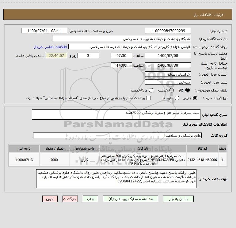 شرح کلی نیاز: ست سرم با فیلتر هوا وسوزن پزشکی 7000عدد