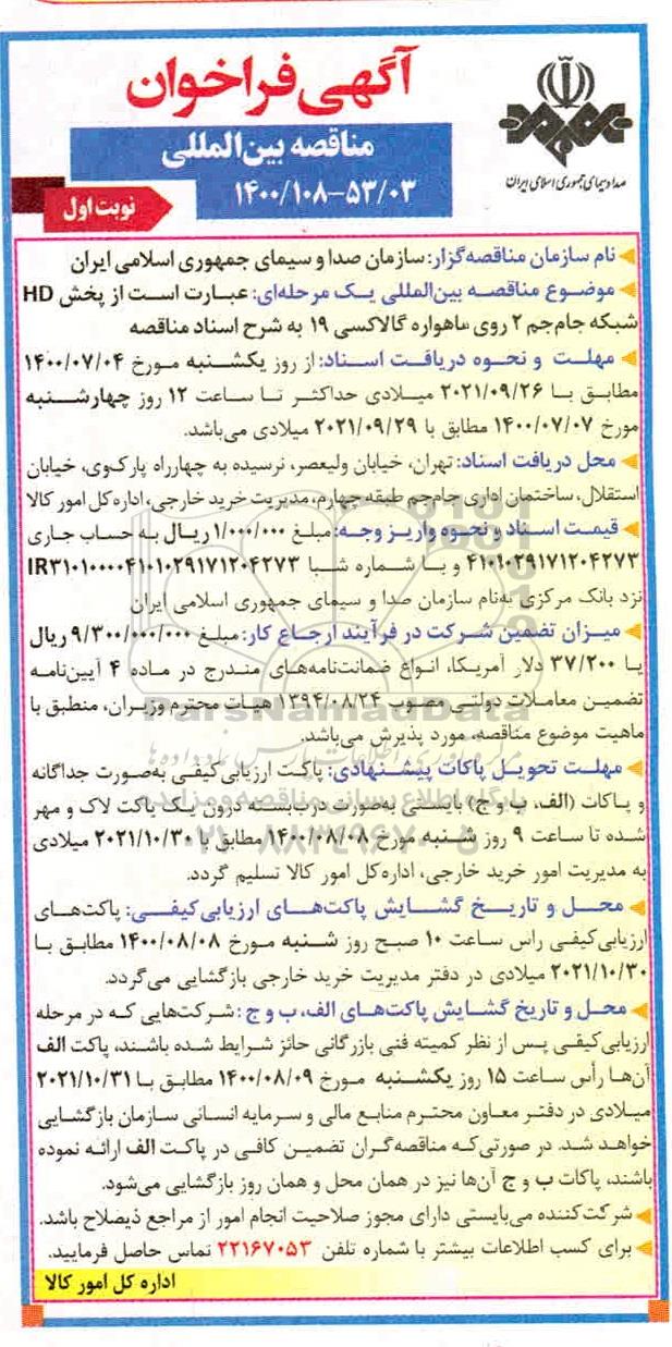- نام سازمان مناقصه گزار: سازمان صدا و سیمای جمهوری اسلامی ایران