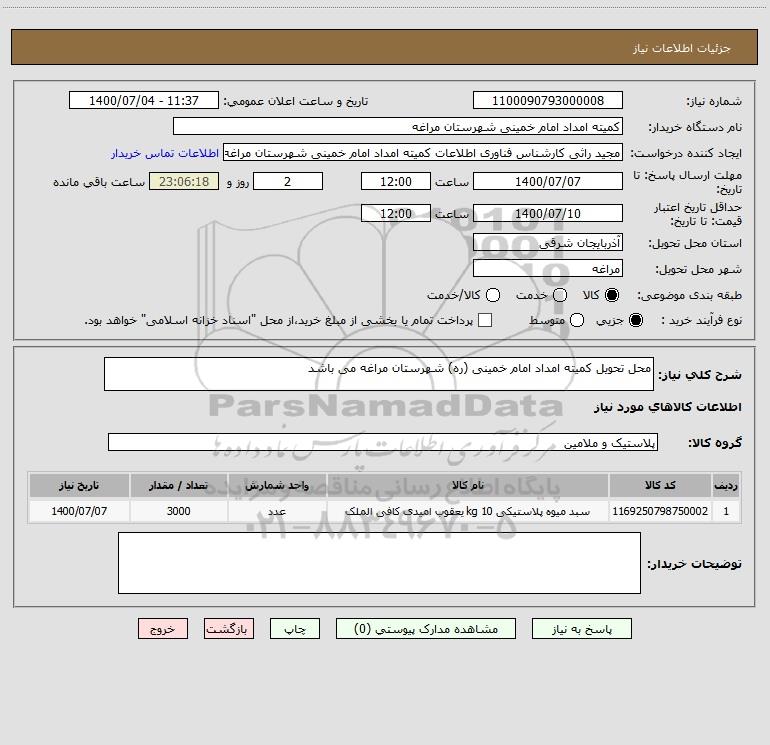 شرح کلی نیاز: محل تحویل کمیته امداد امام خمینی (ره) شهرستان مراغه می باشد