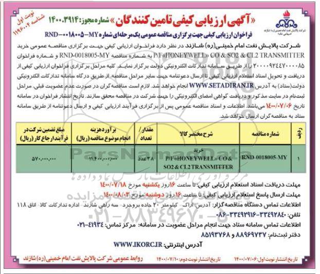 آگهی ارزیابی کیفی تامین کنندگان خرید P/F HONEYWELL CO & SO2 & CI2 TRANSMITTER از کلیه افراد متخصص و شرکتها واجد شرایط دعوت به عمل میآید در مناقصه با کد خبرگزاری پارس نماد: 3803241 شرکت نمایند.