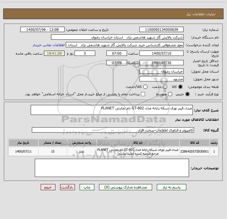 نام دستگاه خریدار:شرکت پالایش گاز شهید هاشمی نژاد استان خراسان رضوی