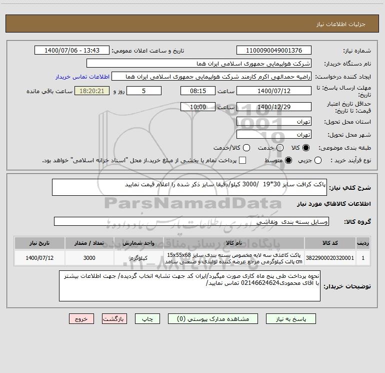 شرح کلی نیاز: پاکت کرافت سایز 30*19 /3000 کیلو/دقیقا سایز ذکر شده را اعلام قیمت نمایید
