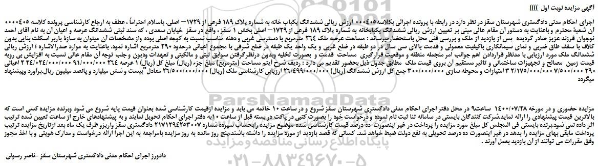 مزایده حضوری و در مورخه 1400/07/28 ساعت9 در محل دفتر اجرای احکام مدنی دادگستری شهرستان سقز شروع و در ساعت 10 خاتمه می یابد و مزایده ازقیمت کارشناسی شده بعنوان قیمت پایه شروع می شود وبرنده مزایده کسی است که بالاترین قیمت پیشنهادی را ارائه نماید.شرکت کنندگان بایستی در سامانه ثنا ثبت نام نموده و درخواست خود را بصورت کتبی در پاکت در بسته قبل از ساعت 10به دفتر اجرای احکام تحویل نمایند و به پیشنهادهای خارج از ساعت تعیین شده ترتیب اثر داده نمی شود.برنده بایستی فی المجلس کل مبلغ مورد مزایده را پرداخت در غیر اینصورت ده درصد قیمت کارشناسی شده موضوع مزایده رابحساب سپرده شماره 2171294253007 دادگستری سقز واریزو ظرف یک ماه بعد ازتاریخ مزایده ترتیب پرداخت مابقی بهای مزایده را بدهد در غیر اینصورت ده درصد تحویلی به نفع دولت ضبط خواهد شد. کسانی که قصد بازدید از مورد مزایده را داشته باشند،پنج روز مانده به روز مزایده بامراجعه به این اجرا ارائه درخواست و مدارک هویتی و با اخذ مجوز وفق مقررات می توانند از آن بازدید بعمل آورند .