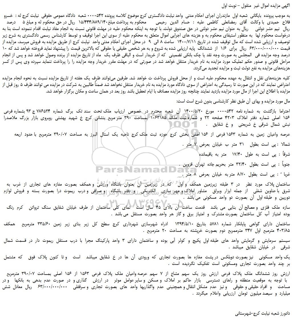 به موجب پرونده بایگانی شعبه اول مازندران اجرای احکام مدنی واحد نیابت دادگستری کرج موضوع کلاسه پرونده 0000542 شعبه دادگاه عمومی حقوقی نیابت کرج له : خسرو فلاح حمیدی با وکالت آقای رمضانعلی کاظمی علیه : حسام الدین رحیمی محکوم به پرداخت مبلغ15/444/889/140 ریال در حق محکوم له و مبلغ 5 درصد ریال نیم عشر دولتی ریال به عنوان نیم عشر دولتی در حق صندوق دولت. با توجه به اینکه محکوم علیه در مهلت قانونی نسبت به انجام مفاد نیابت اقدام ننموده است بنا به درخواست محکوم لها به منظور استیفای محکوم به و هزینه های اجرایی اموال متعلق به محکوم علیه از سوی این اجرا توقیف و توسط کارشناس رسمی دادگستری به شرح زیر توصیف و ارزیابی شده است که مال توقیف شده در تاریخ 1400/7/11 ساعت 8 الی 9 در محل اجرای احکام مدنی واحد نیابت کرج از طریق مزایده به فروش میرسد، مزایده از قیمت 63/000/000/000 ریال برای 1/6 از ششدانگ پایه ارزیابی شده به شروع و به هر شخص حقیقی یا حقوقی که بالاترین قیمت را پیشنهاد نماید فروخته خواهد شد که ۱۰ درصد وجه مزایده فی المجلس به صورت وجه نقد یا چک بانکی تضمینی که از خریدار است و الباقی ظرف یک ماه از تاریخ مزایده از برنده وصول خواهد شد و پس از انجام مراحل قانونی و صدور حکم تملیک مورد مزایده به نام خریدار منتقل خواهد شد در صورتی که در مهلت مقرر خریدار وجه مزایده را را پرداخت ننماید سپرده وی پس از کسر هزینه های مزایده به نفع دولت ثبت و مزایده تجدید می گردد.
