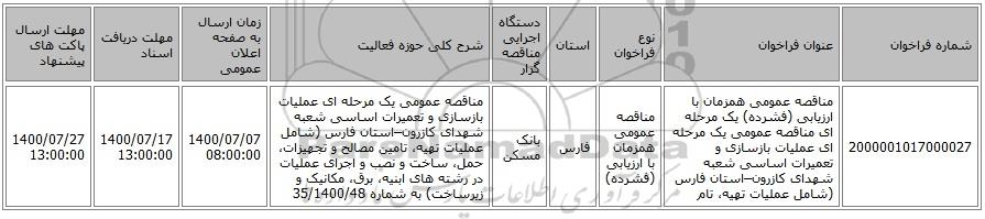 مناقصه، مناقصه عمومی همزمان با ارزیابی (فشرده) یک مرحله ای مناقصه عمومی یک مرحله ای عملیات بازسازی و تعمیرات اساسی شعبه شهدای کازرون–استان فارس (شامل عملیات تهیه، تام از کلیه افراد متخصص و شرکتها واجد شرایط دعوت به عمل میآید در مناقصه با کد خبرگزاری پارس نماد: 3805872 شرکت نمایند.
