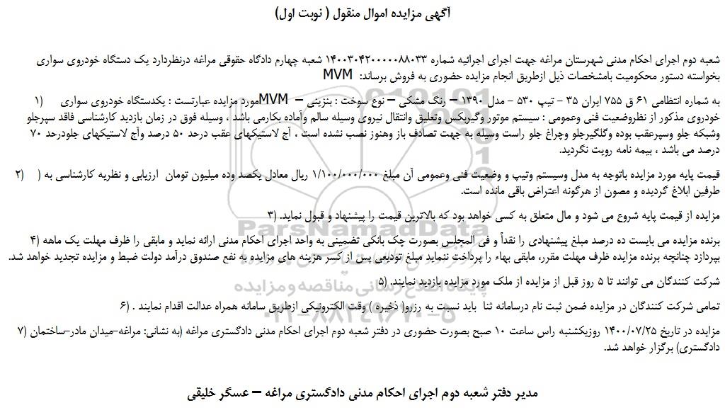 شعبه دوم اجرای احکام مدنی شهرستان مراغه جهت اجرای اجرائیه شماره 140030420000088033 شعبه چهارم دادگاه حقوقی مراغه درنظردارد یک دستگاه خودروی سواری MVM بخواسته دستور محکومیت بامشخصات ذیل ازطریق انجام مزایده حضوری به فروش برساند: