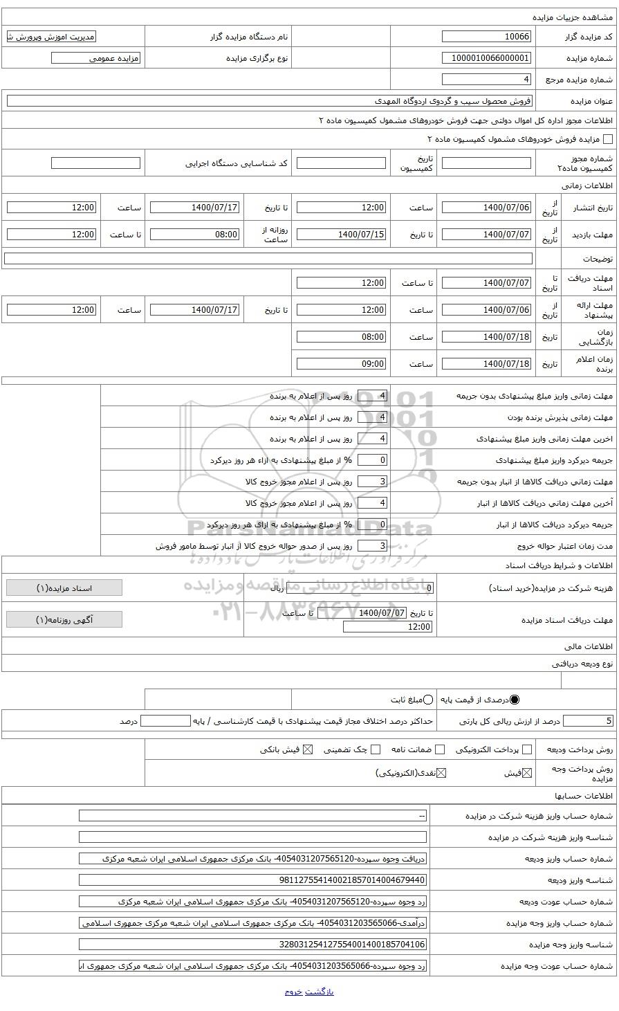 | عنوان مزایده | فروش محصول سیب و گردوی اردوگاه المهدی مراغه | |||