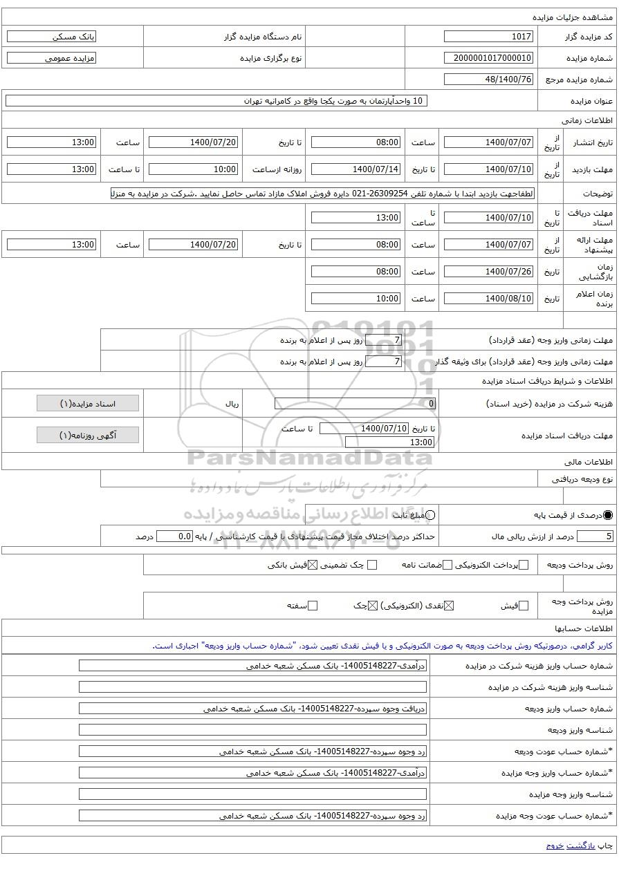 شماره حساب واریز وجه مزایده | درآمدی-14005148227- بانک مسکن شعبه خدامی |