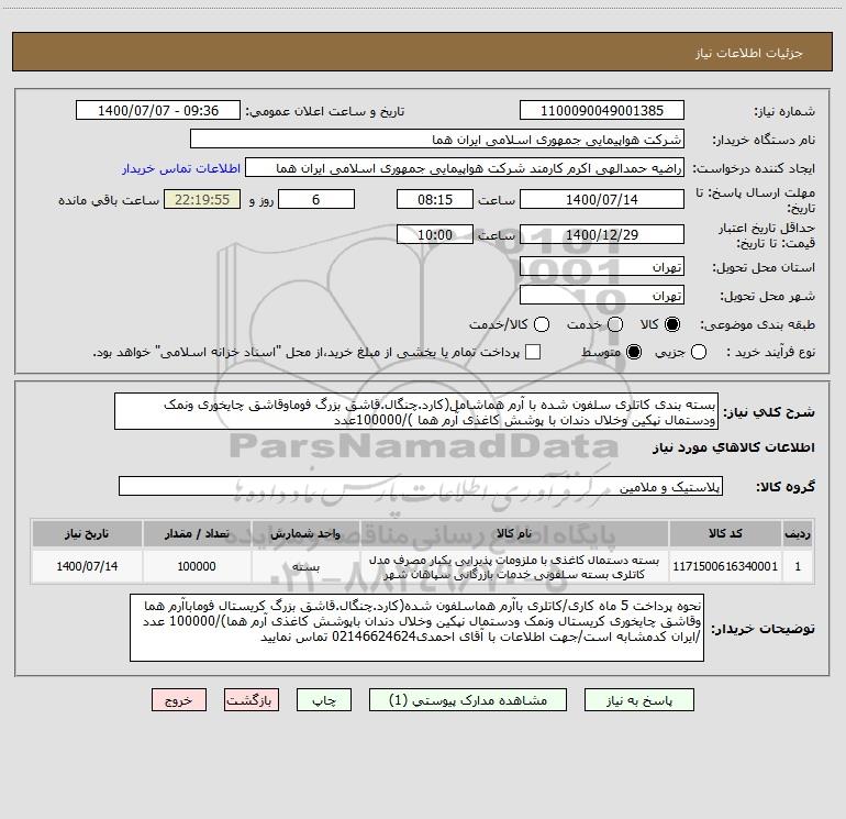 استعلام بسته بندی کاتلری سلفون شده با آرم هماشامل(کارد.چنگال.قاشق بزرگ فوماوقاشق چایخوری ونمک ودستمال نپکین وخلال دندان با پوشش کاغذی آرم هما )/100000عدد, استعلام بسته بندی کاتلری سلفون شده با آرم هماشامل(کارد.چنگال.قاشق بزرگ فوماوقاشق چایخوری ونمک ودستمال نپکین وخلال دندان با پوشش کاغذی آرم هما )/100000عدد