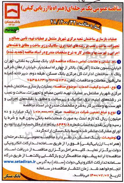 بانک مسکن در نظر دارد مناقصه عمومی یک مرحله ای همراه با ارزیابی کیفی فوق را از طریق سامانه تدارکات الکترونیکی دولت برگزار نماید. کلیه مراحل برگزاری مناقصه از دریافت اسناد مناقصه تا ارائه پیشنهاد مناقصه گران و بازگشایی پاکات از طریق درگاه سامانه دولت به نشانی ستاد ایران انجام خواهد شد