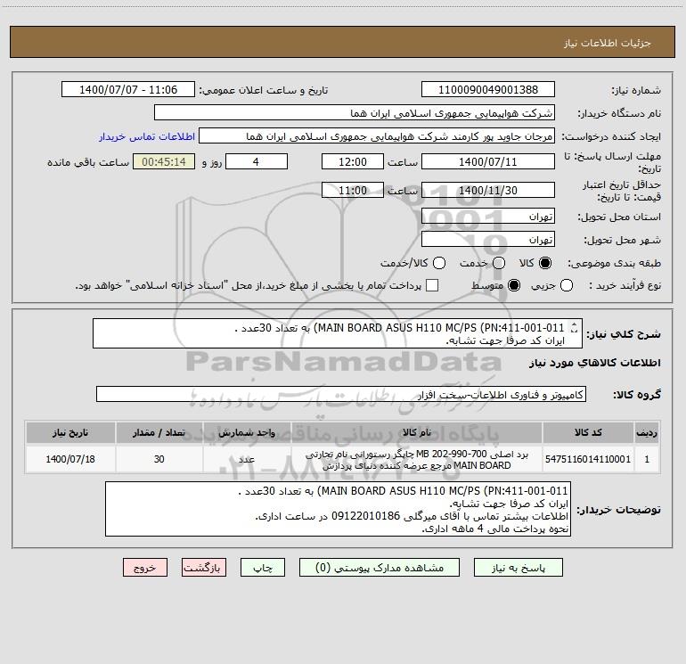 شرح کلی نیاز: MAIN BOARD ASUS H110 MC/PS (PN:411-001-011) به تعداد 30عدد . ایران کد صرفا جهت تشابه. اطلاعات بیشتر توضیحات مطالعه شود.