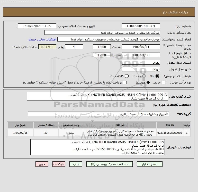 شرح کلی نیاز: MOTHER BOARD ASUS H81M-K (PN:411-001-009) به تعداد 20عدد. ایران کد صرفا جهت تشابه. اطلاعات بیشتر توضیحات مطالعه شود.