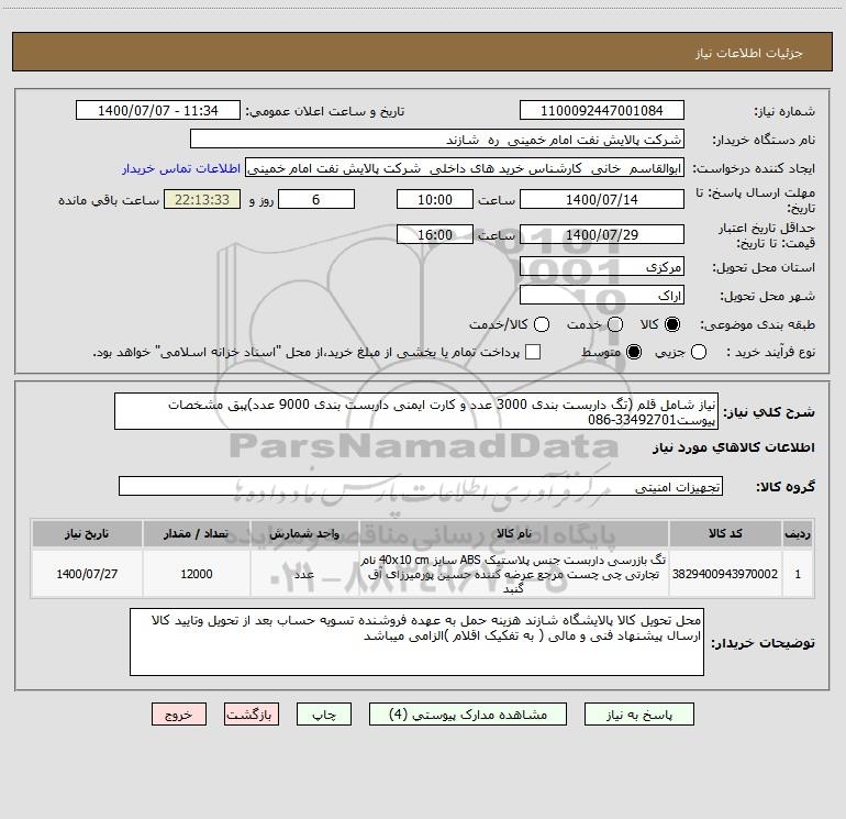شرح کلی نیاز: نیاز شامل قلم (تگ داربست بندی 3000 عدد و کارت ایمنی داربست بندی 9000 عدد)پبق مشخصات پیوست33492701-086