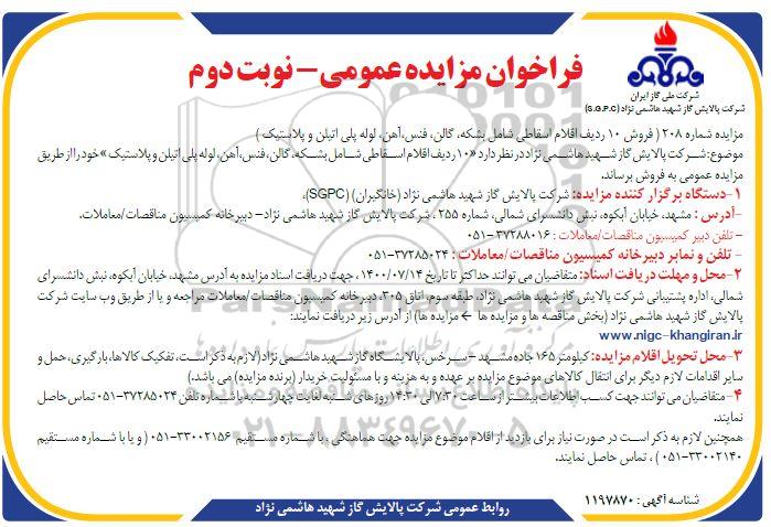 موضوع: شرکت پالایش گاز شهید هاشمی نژاد در نظر دارد 10 ردیف اقلام اسقاطی شامل بشکه، گالن، فنس، آهن، لوله پلی اتیلن و پلاستیک خود را از طریق مزایده عمومی به فروش برساند