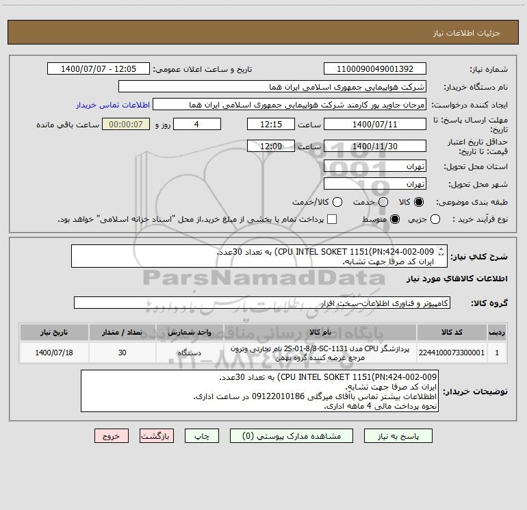 توضیحات خریدار:CPU INTEL SOKET 1151(PN:424-002-009) به تعداد 30عدد. ایران کد صرفا جهت تشابه. اطظلاعات بیشتر تماس باآقای میرگلی 09122010186 در ساعت اداری. نحوه پرداخت مالی 4 ماهه اداری.