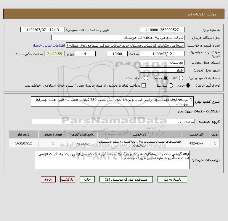شرح کلی نیاز: توسعه ابعاد فونداسیون ترانس قدرت و بریدن دیوار آتش پست 230 کیلولت هفت تپه طبق نقشه وشرایط پیوست. برآورد اولیه : -/1,550,000,000ریال