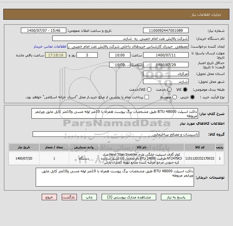 شرح کلی نیاز: داکت اسپلت 48000 BTU طبق مشخصات برگ پیوست همراه با 10متر لوله مسی و10متر کابل عایق وپرایمر مربوطه
