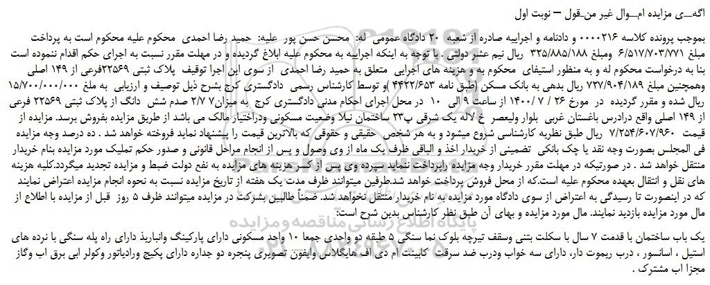 بموجب پرونده کلاسه 0000216 و دادنامه و اجراییه صادره از شعبه 20 دادگاه عمومی له: محسن حسن پور علیه: حمید رضا احمدی محکوم علیه محکوم است به پرداخت مبلغ 6/517/703/771 ومبلغ 325/885/188 ریال نیم عشر دولتی . با توجه به اینکه اجراییه به محکوم علیه ابلاغ گردیده و در مهلت مقرر نسبت به اجرای حکم اقدام ننموده است بنا به درخواست محکوم له و به منظور استیفای محکوم به و هزینه های اجرایی متعلق به حمید رضا احمدی از سوی این اجرا توقیف پلاک ثبتی 22569فرعی از 149 اصلی وهمچنین مبلغ 727/904/189 ریال بدهی به بانک مسکن (طبق نامه 4422/653 )و توسط کارشناس رسمی دادگستری کرج بشرح ذیل توصیف و ارزیابی به ملغ 15/700/000/000 ریال شده و مقرر گردیده در مورخ 26 / 7 /1400 از ساعت 9 الی 10 در محل اجرای احکام مدنی دادگستری کرج به میزان7 2/7 صدم شش دانگ از پلاک ثبتی 22569 فرعی از 149 اصلی واقع درادرس باغستان غربی بلوار ولیعصر خ لاله یک شرقی پ23 ساختمان نیلا وضعیت مسکونی ودراختیار مالک می باشد از طریق مزایده بفروش برسد. مزایده از قیمت 7/254/607/960 ریال طبق نظریه کارشناسی شروع میشود و به هر شخص حقیقی و حقوقی که بالاترین قیمت را پیشنهاد نماید فروخته خواهد شد . ده درصد وجه مزایده فی المجلس بصورت وجه نقد یا چک بانکی تضمینی از خریدار اخذ و الباقی ظرف یک ماه از وی وصول و پس از انجام مراحل قانونی و صدور حکم تملیک مورد مزایده بنام خریدار منتقل خواهد شد . در صورتیکه در مهلت مقرر خریدار وجه مزایده راپرداخت ننماید سپرده وی پس از کسر هزینه های مزایده به نفع دولت ضبط و مزایده تجدید میگردد.کلیه هزینه های نقل و انتقال بعهده محکوم علیه است.که از محل فروش پرداخت خواهد شد.طرفین میتوانند ظرف مدت یک هفته از تاریخ مزایده نسبت به نحوه انجام مزایده اعتراض نمایند که در اینصورت تا رسیدگی به اعتراض از سوی دادگاه مورد مزایده به نام خریدار منتقل نخواهد شد. ضمناً طالبین بشرکت در مزایده میتوانند ظرف 5 روز قبل از مزایده با اطلاع از مال مورد مزایده بازدید نمایند. مال مورد مزایده و بهای آن طبق نظر کارشناس بدین شرح است: