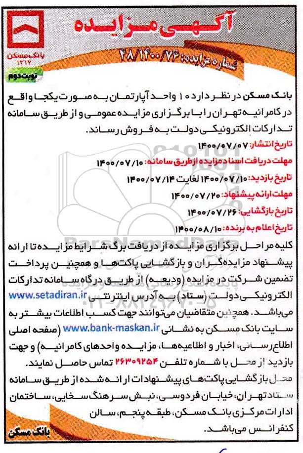 مزایده عمومی مزایده فروش 10 واحد آپارتمان به صورت یکجا نوبت دوم برگزار میگردد. از کلیه افراد متخصص و شرکتهای واجد شرایط دعوت به عمل میآید تا در این مزایده با کد خبرگزاری پارس نماد : 3810548 شرکت نمایند تاریخ شروع مزایده : 1400/07/08 مهلت شرکت در مزایده: تا پایان روز 1400/07/14