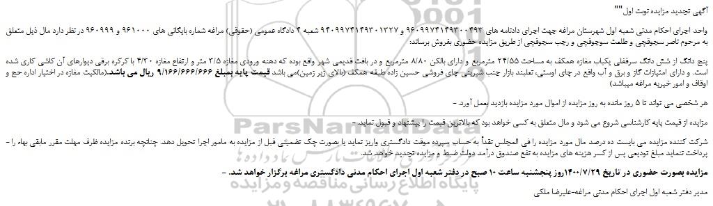 - مزایده بصورت حضوری در تاریخ 1400/7/29روز پنجشنبه ساعت 10 صبح در دفتر شعبه اول اجرای احکام مدنی دادگستری مراغه برگزار خواهد شد.