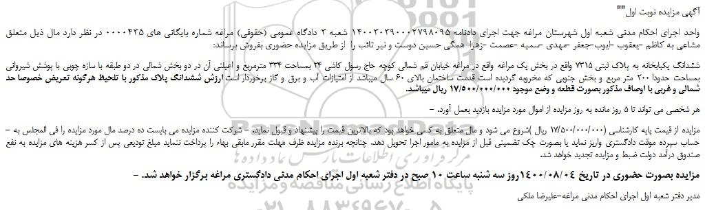 - مزایده بصورت حضوری در تاریخ 1400/08/04روز سه شنبه ساعت 10 صبح در دفتر شعبه اول اجرای احکام مدنی دادگستری مراغه برگزار خواهد شد.