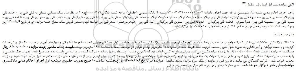 ششدانگ پلاک ثبتی 5550 اصلی بخش 1 مراغه واقع در مراغه میدان قطب ابتدای کوچه گورانها جنب نانواییها پلاک ثبتی مذکور یکباب خانه مسکونی به شکل ویلایی که با مصالح مختلط بنائی و دیوارهای آجری در حدود 40 سال پیش احداث گردیده و با سقف تیرآهن و آجر فشاری به صورت طاق ضربی مسقف گردیده است عرصه خانه در حدود 138 متر مربع بوده و اعیانی در دوطبقه جمعا به مساحت 160 مترمربع میباشد.قیمت پلاک مذکور جهت مزایده 8/000/000/000 ریال میباشد. - مزایده از قیمت پایه(8/000/000/000 ریال) مورد مزایده شروع می شود و مال متعلق به کسی خواهد بود که بالاترین قیمت را پیشنهاد و قبول نماید - شرکت کننده در مزایده می بایست ده درصد مبلغ پایه را بصورت چک تضمینی و یا به حساب سپرده موقت دادگستری واریز نماید و مابقی را ظرف مهلت یک ماهه بپردازد. چنانچه برنده مزایده ظرف مهلت مقرر مابقی بهاء را پرداخت ننماید مبلغ تودیعی پس از کسر هزینه های مزایده به نفع صندوق درآمد دولت ضبط و مزایده تجدید خواهد شد. -شرکت کنندگان می توانند تا 5 روز قبل از مزایده از ملک مورد مزایده بازدید نمایند. - مزایده در تاریخ 1400/08/06 روز پنجشنبه ساعت 10 صبح بصورت حضوری درشعبه اول اجرای احکام مدنی دادگستری مراغه(میدان مادر ) برگزار خواهد شد. مدیر دفتر شعبه اول اجرای احکام مدنی مراغه-علیرضا ملکی